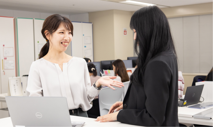 営業企画部は、求人関連業務や新卒採用業務を行う部署で、私は派遣スタッフ募集の求人関連業務を主に担当しています。また、課長として後輩社員のマネジメントや、営業会議に参加して営業部門の売上に繋がるような資料の作成、見直しも行っています。この仕事のやりがいは、たくさんの「感謝」をいただけることです。自分が作成した営業資料や求人募集で成果が出た際に、感謝されることが何より嬉しいです。